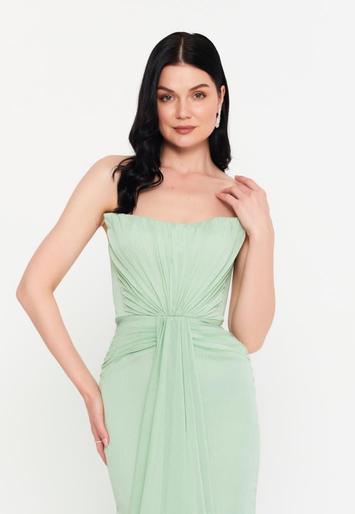 اجذبي الأنظار بجمالك الساحر وحضورك الراقي مع هذا الفستان بلونه الأخضر النعناعي الهادئ، المصمم ليمنحك إطلالة فاخرة لا تُنسى في مناسباتك الخاصة. يجمع الفستان بين الأناقة الكلاسيكية واللمسة العصرية، مما يجعله القطعة المثالية لحفلاتك وسهراتك.